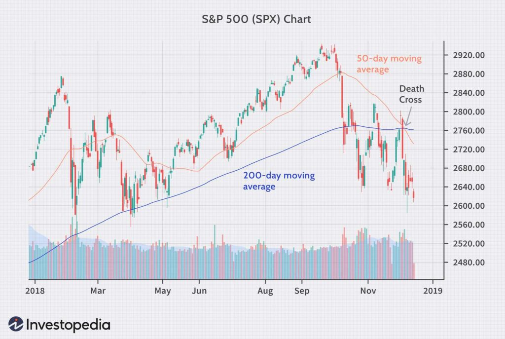 Death Cross på S&P 500 – MA50 (orange) korsar ner genom MA200 (blå).